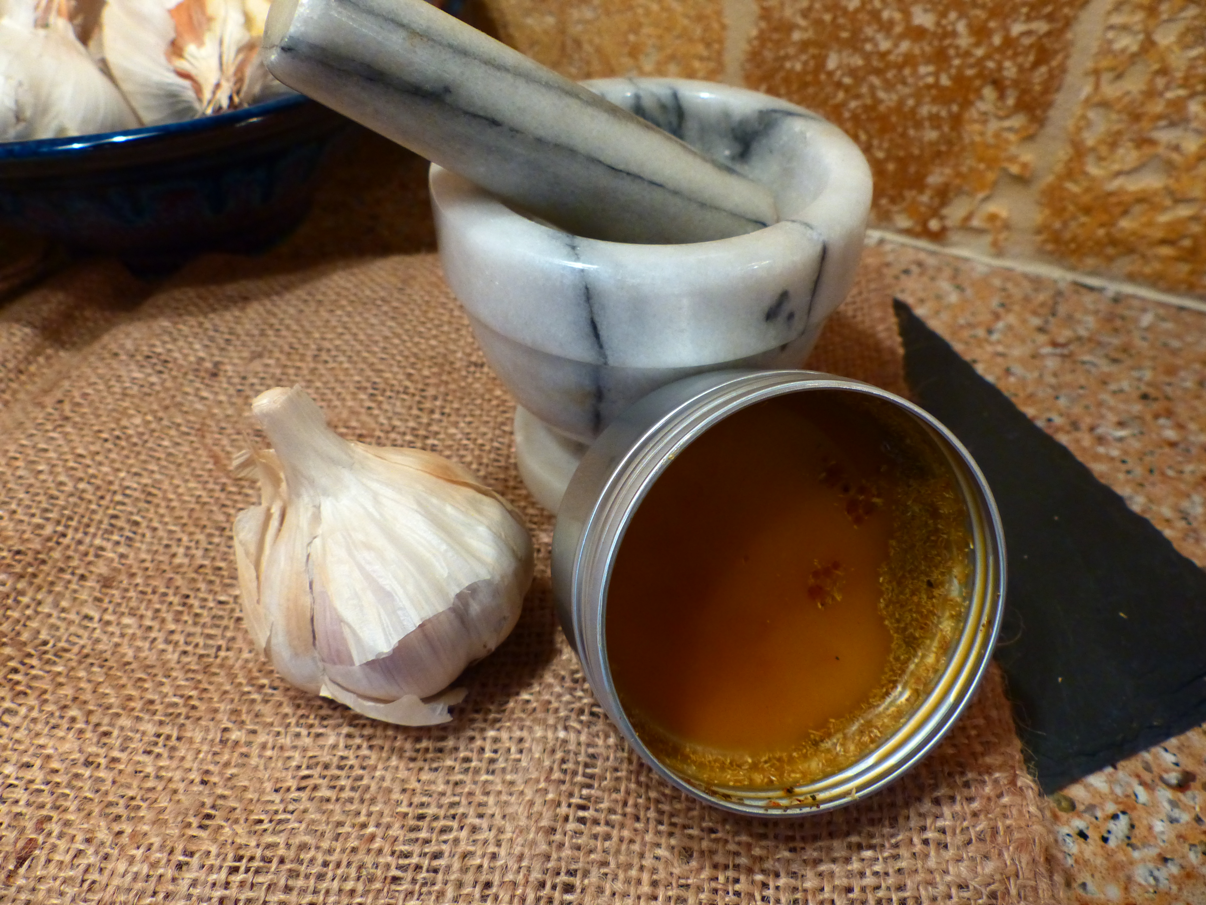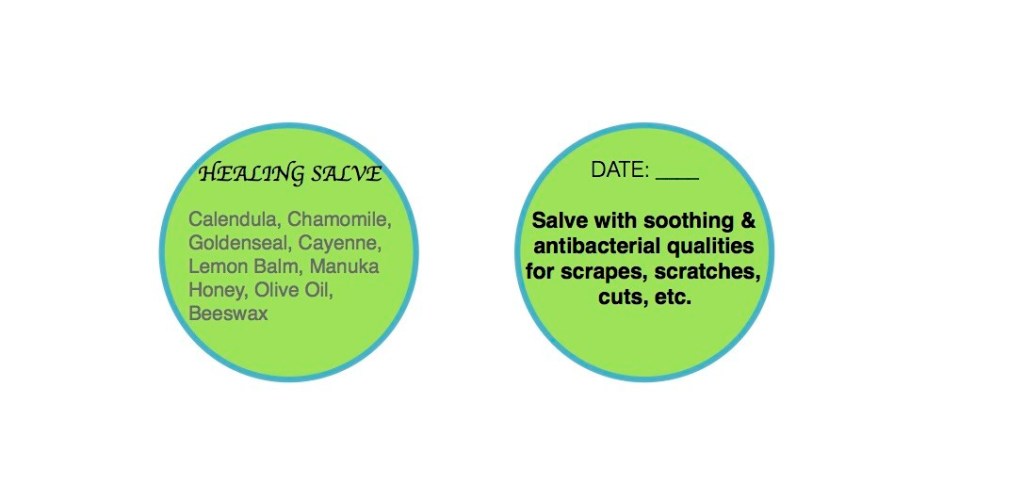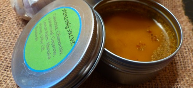 Melt beeswax, olive oil, and honey together. When the beeswax has melted, add in your herbs, and stir to combine. Let the herbs “steep” in your mixture on low heat. Strain excess large pieces of herbs out using a tea strainer or sieve. Pour into metal tins/storage containers.
