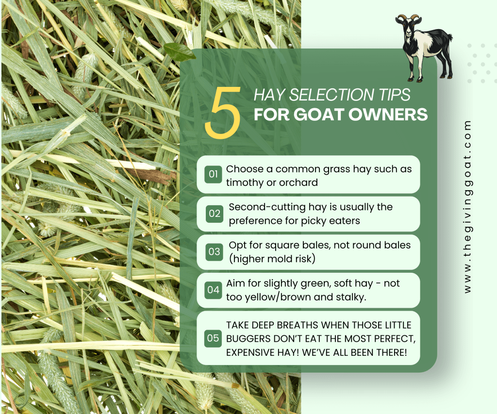 So when I reference hay, I am talking about it as a staple of a goat’s diet. I would never let a day go by that my goats don’t have hay out for them 24/7. To determine how much hay to offer, put out hay by the flake and observe to see how much is consumed. You should put out slightly more than what is finished in an average day, so that there is always hay available. If it is within your management abilities, I recommend this observing and adjusting technique instead of putting out larger quantities that remain over many days/weeks, because goats prefer fresh hay daily.
