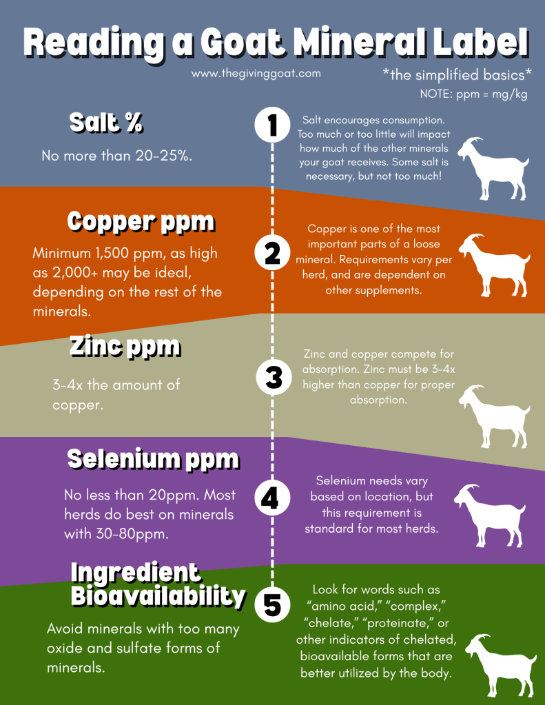 Minerals are the most complex part of the diet. You read a sneak-peek above, but minerals are extremely difficult to balance. For a more comprehensive perspective, see the article on mineral nutrition. As a baseline, goats should have 24/7 access (free choice) to a high quality loose mineral blend. Loose minerals are required as opposed to blocks. Unlike cows with their rough tongues, goats cannot get the necessary nutrients from blocks. Additionally, blocks are usually formulated with too much salt or fillers for goats. There are many brands of loose minerals, though not all are created equal. It is important to learn how to read and understand a mineral label to determine if it meets the needs of your herd. Here is a helpful cheat sheet: