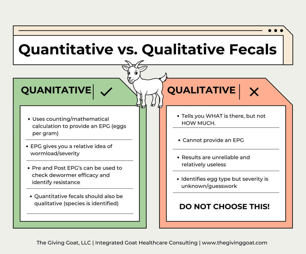 Qualitative fecals tell you WHAT is present, but counting/mathematical calculation is not performed, which prevents the determination of the relative severity or burden. These types of tests are not useful for goat owners, because goats are always expected to have positive tests, unlike dogs and cats. A positive test by itself does not mean a goat requires treatment. Many factors are considered when discussing parasite levels in goats.