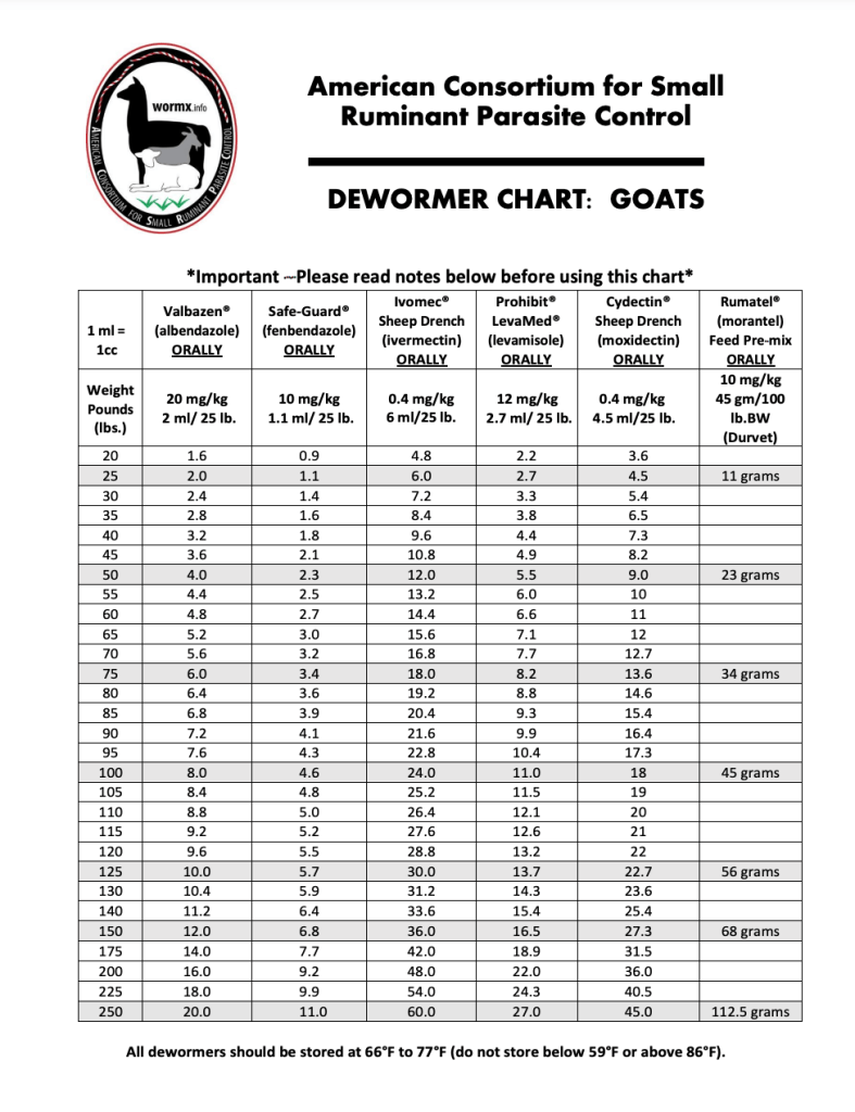 - Always follow the Updated Goat Dewormer Chart to determine dosages.