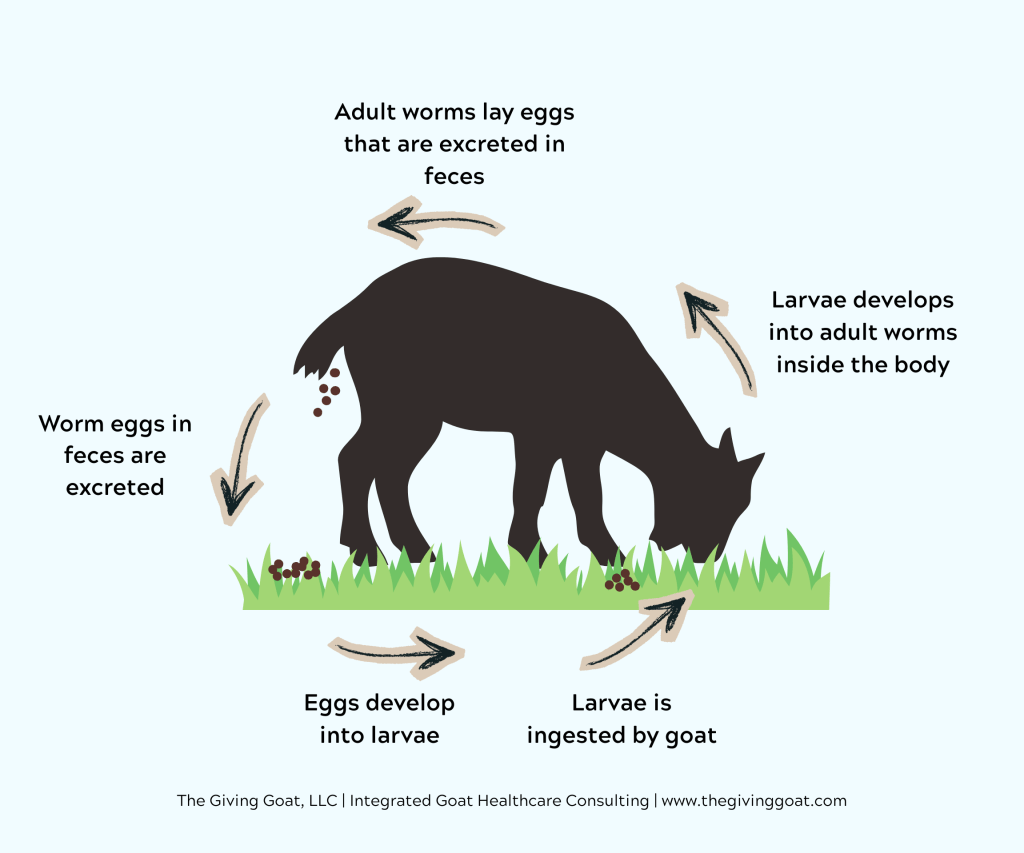 Grazing is one of the best ways for parasites to re-infect goats and complete their life cycles. Goats are made to browse above ground level, thereby consuming weeds, branches, and other forages besides grass. When we force goats to a ground level grazing environment, we increase the amount of worm larvae they consume. Put simply, goats poop on pastures, and the climate and moist grassy environment allows the larvae in their stool to develop and become infective larvae. Then, goats continue to graze on the larvae-infested grass, and ingest infective larvae that mature into adult worms, which then lay eggs that become larvae.